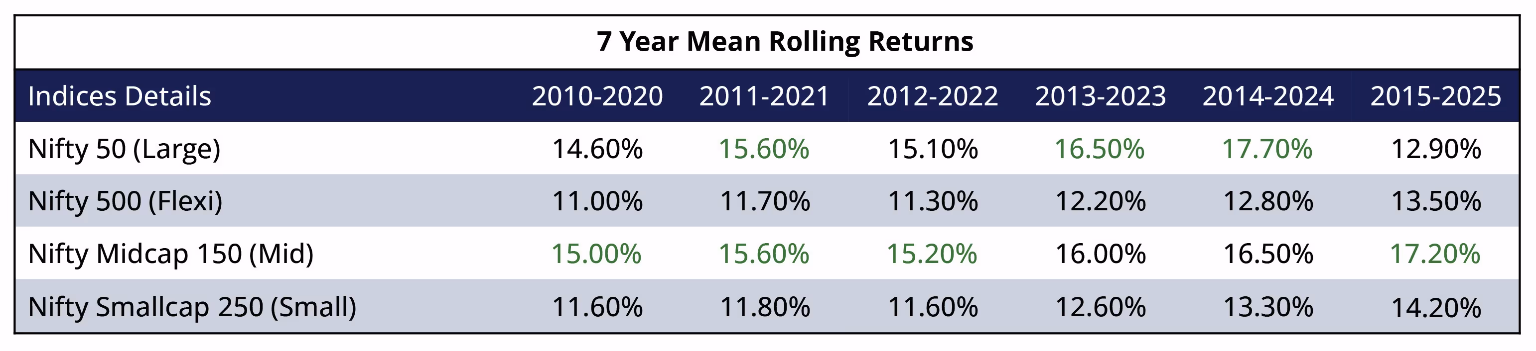 The rolling seven-year returns across major indices reveal important structural shifts. The Nifty 50 has delivered CAGRs ranging from 12.9% to 17.7%, with the most recent decade showing moderation to 12.9%. The Nifty 500 has demonstrated greater consistency at 11-13.5%. Most notably, the Nifty Midcap 150 has emerged as the standout performer in the latest decade, delivering 17.2% CAGR compared to the Nifty 50's 12.9%—a fundamental shift where mid-sized companies have seized market leadership.