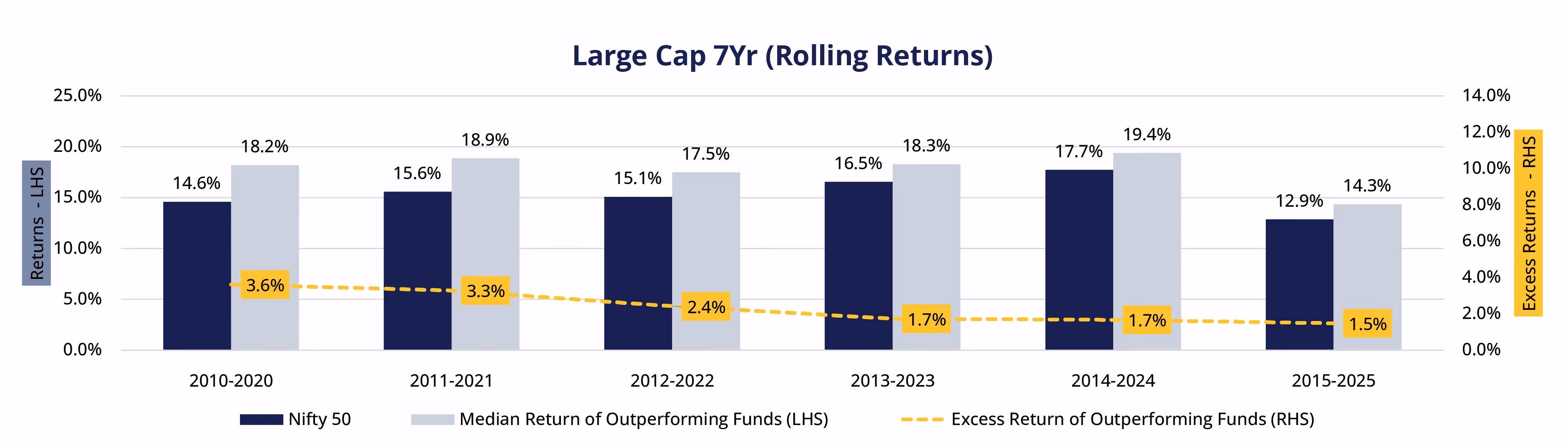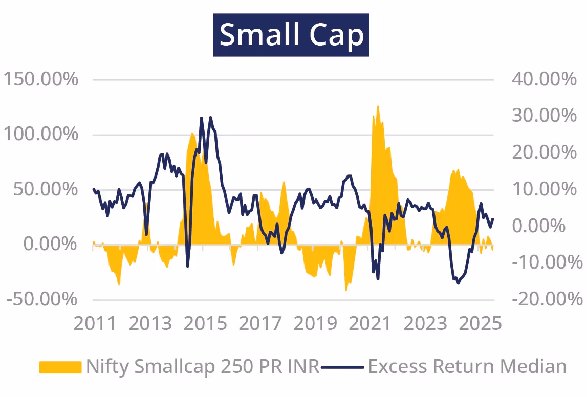 The cyclical analysis shows large-cap active management has evolved from consistent alpha generation to selective positioning. Excess returns have largely faded post-2017, with funds mirroring benchmarks during rallies but showing mild outperformance during corrections.