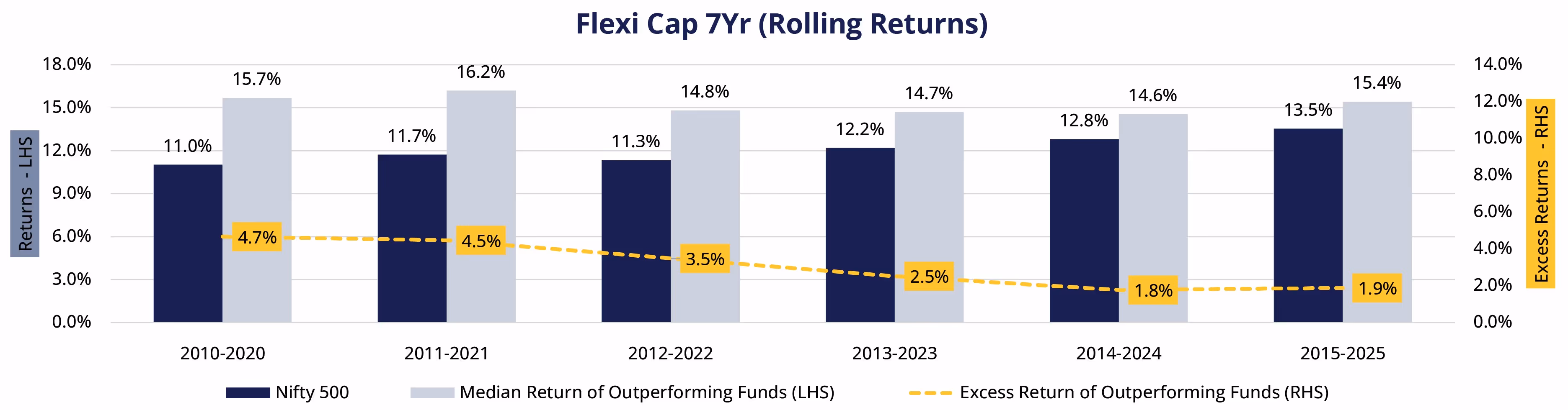 Notably, flexi-cap outperformance appears cyclical: rates peak during periods encompassing corrections (86% in 2011-2021) and decline during extended rallies (47% in 2015-2025), aligning with the thesis that active managers add value when reallocating across market caps during dislocations.