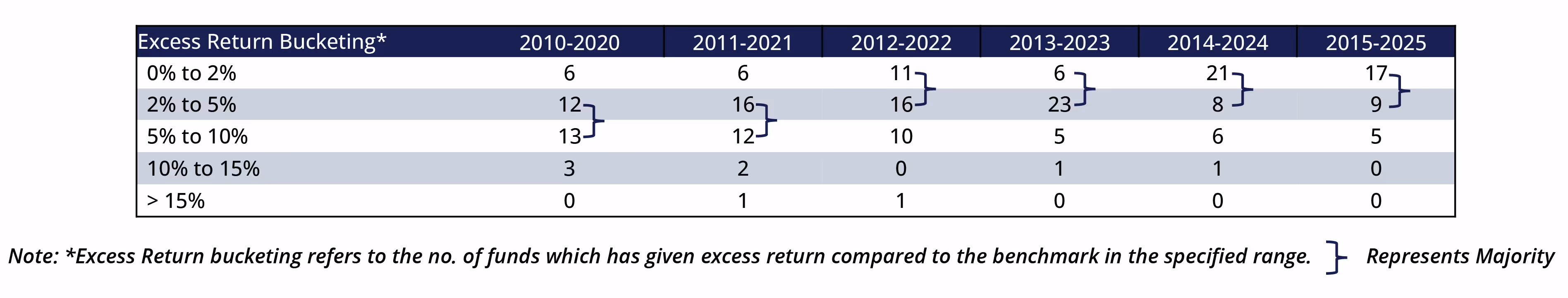 The large-cap segment demonstrates a clear pattern of declining active outperformance. The fund universe has remained relatively stable at 24-28 funds, yet outperforming funds have declined from 20 (83%) to just 11 (39%). The excess return distribution has shifted decisively toward the 0-2% bucket, where eight of eleven outperformers now cluster. The 5-10% excess return bucket, which housed six funds in 2010-2020, has vanished entirely by the latest period.