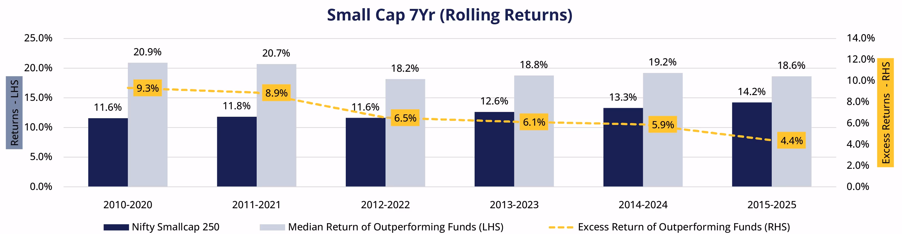 This analysis examines seven years of rolling returns across multiple market capitalizations in Indian equity markets, revealing significant divergence in active management effectiveness across segments. The data shows that active management's ability to generate consistent alpha has become increasingly segment-dependent, with large-cap and mid-cap strategies facing substantial headwinds while small-cap approaches continue demonstrating meaningful value addition. Concurrently, factor-based indices have emerged as systematic alternatives, delivering superior risk-adjusted returns across market conditions.