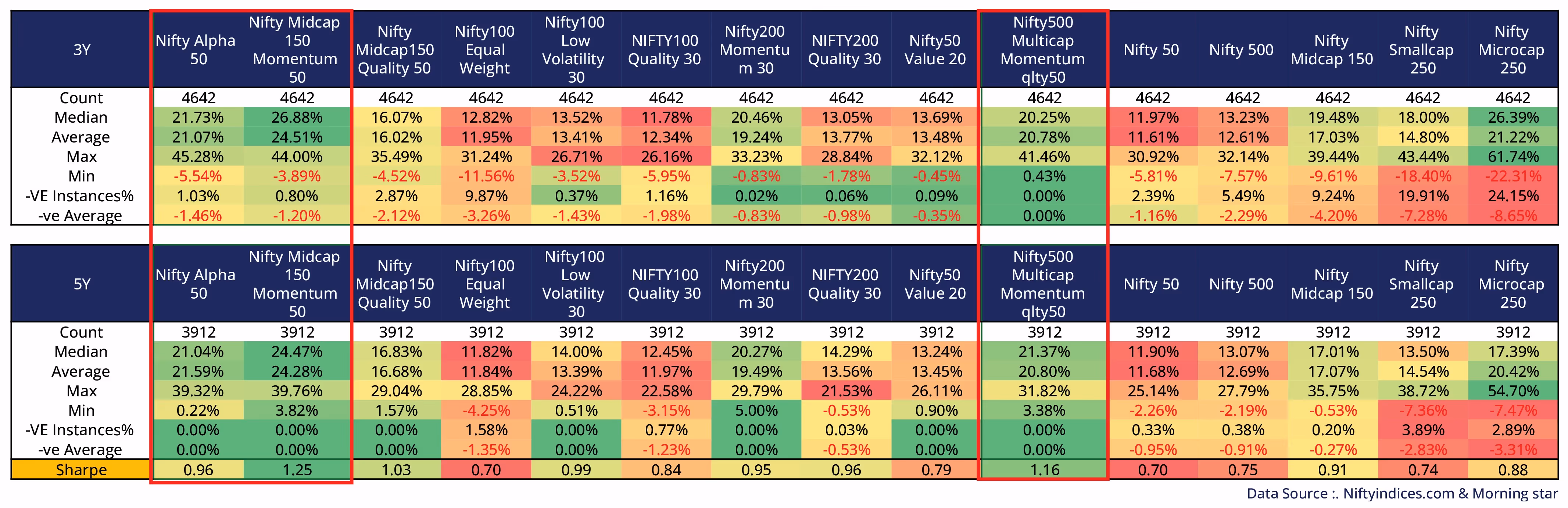 Momentum dominance: The Nifty Midcap 150 Momentum 50 achieves exceptional performance: 26.88% median 3-year returns, 1.25 Sharpe ratio, and zero negative 5-year periods. The Nifty 500 Momentum Quality 50 delivers 20.25% median returns with 1.16 Sharpe, blending momentum's return potential with quality's downside protection. The Nifty 200 Momentum 30 provides 20.46% returns with 0.95 Sharpe.