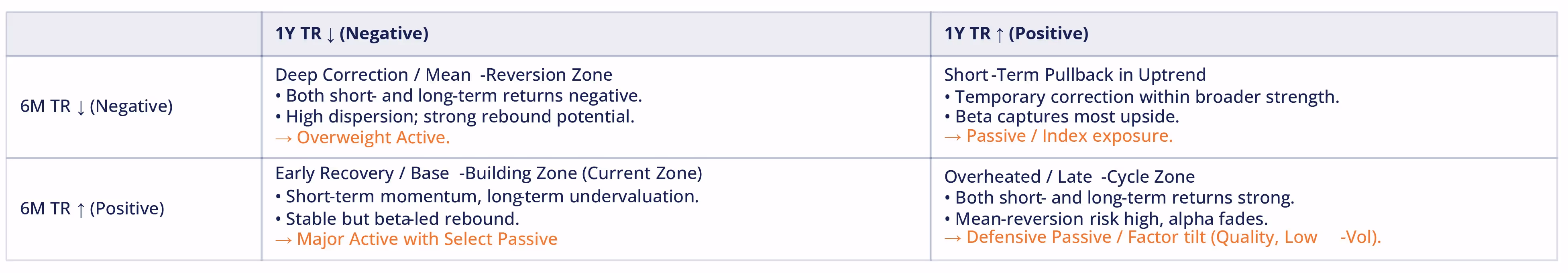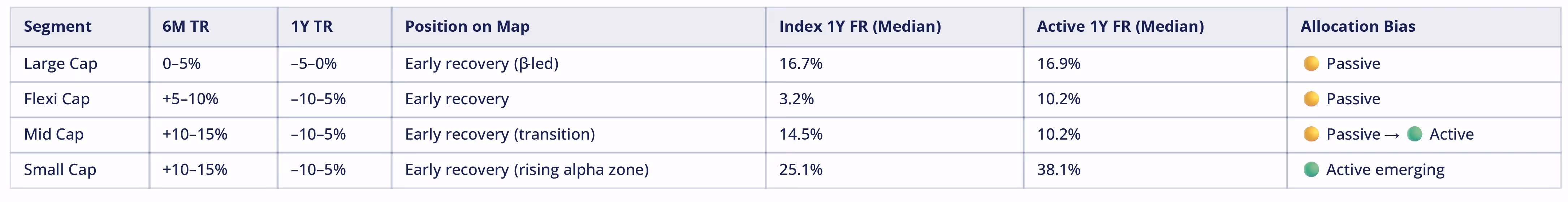 Large-cap: Characterized by high efficiency, with only 39% of active funds outperforming and excess returns compressed to 0-2%. Current regime shows early recovery with negligible active-passive forward return differential (20 basis points).